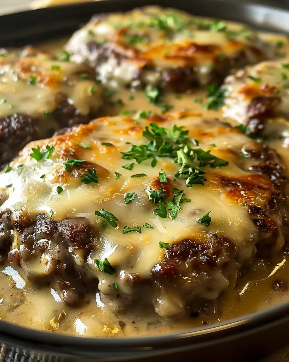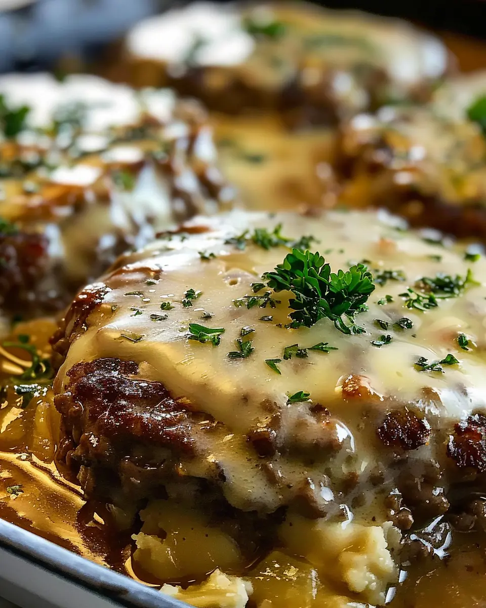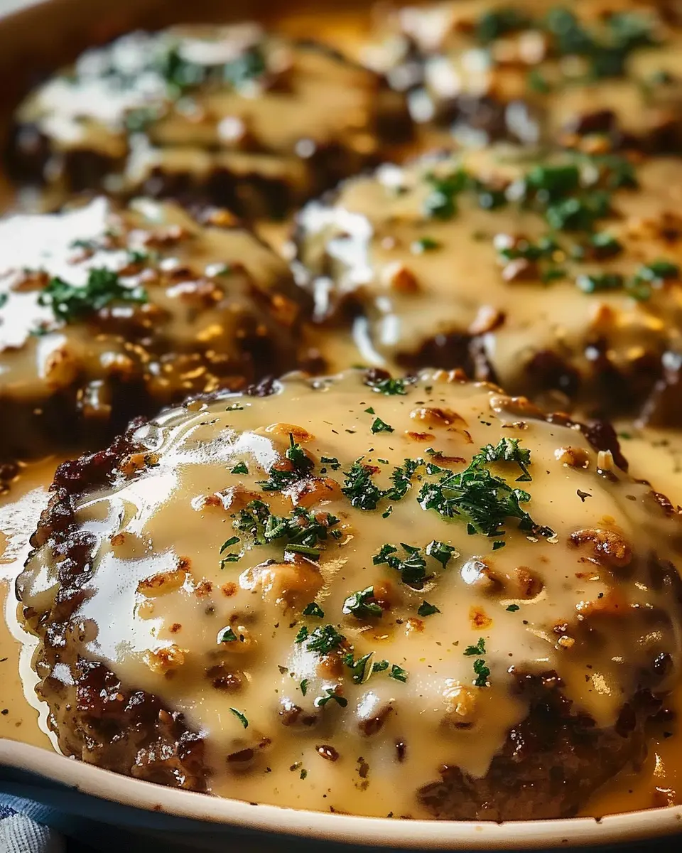 The final step is where all the flavors meld together. Preheat your oven to 350°F (175°C). In a baking dish, pour the gravy first to create a bed for the patties. Then lay the seared hamburger steaks atop the gravy.