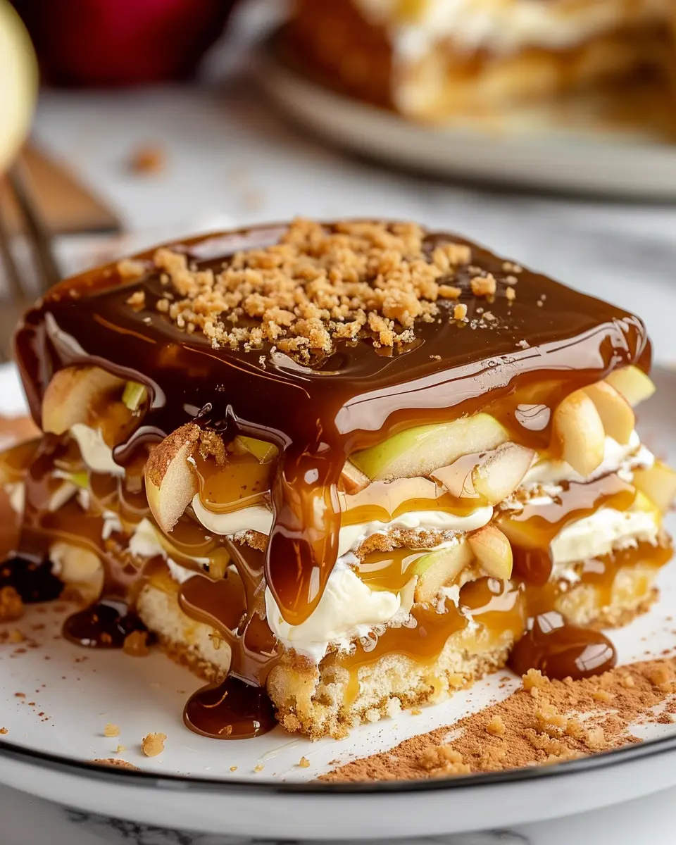 Indulge in this rich and creamy Caramel Apple Eclair Cake that combines the flavors of caramel and apple in a delightful dessert.