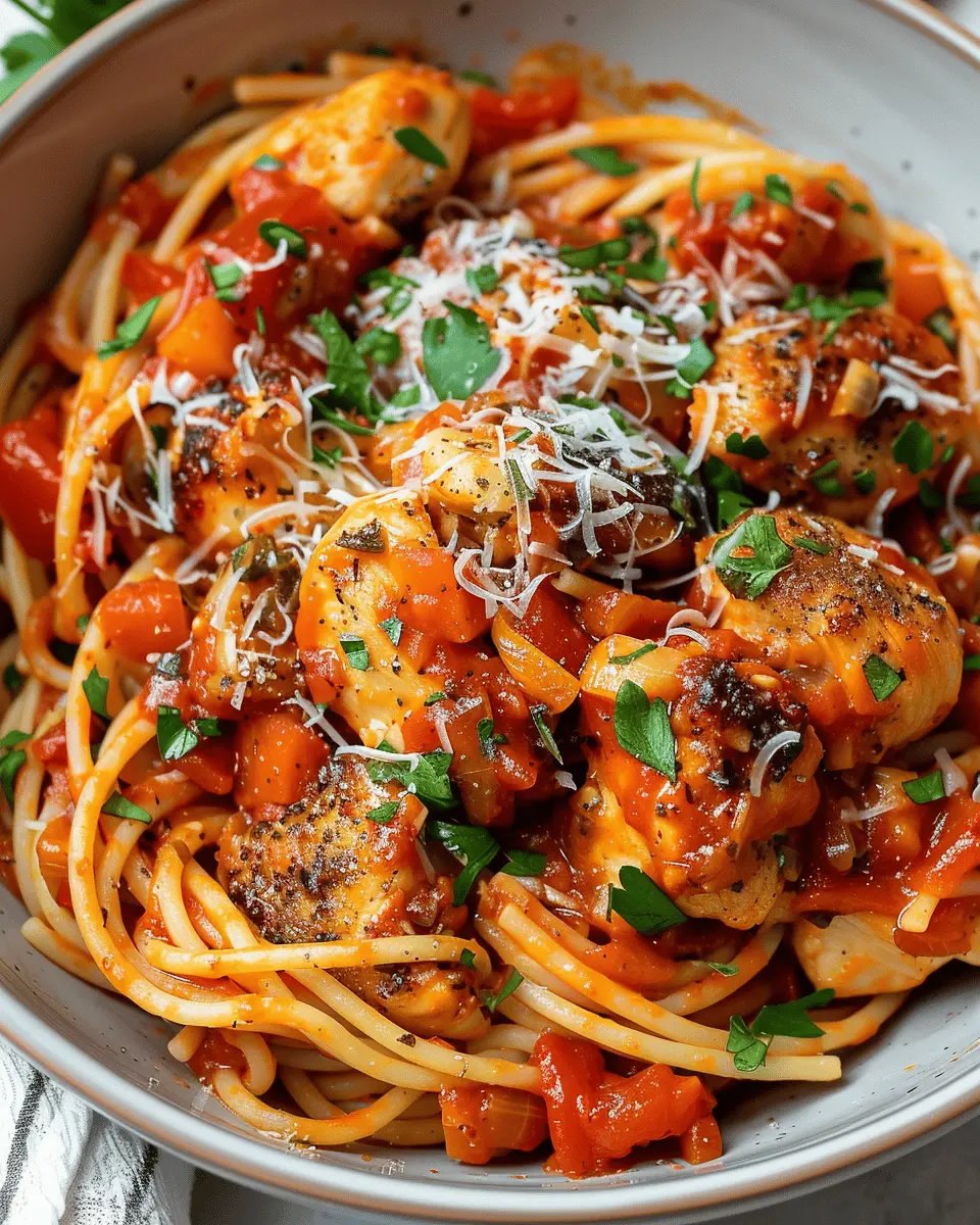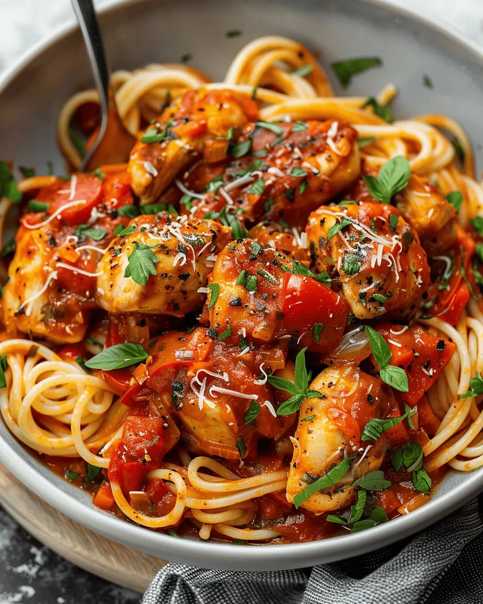 Enjoy a hearty and flavorful Chicken Cacciatore Pasta that is perfect for busy weeknight dinners. This dish brings together tender chicken, rich tomato sauce, and comforting pasta for a delightful meal.