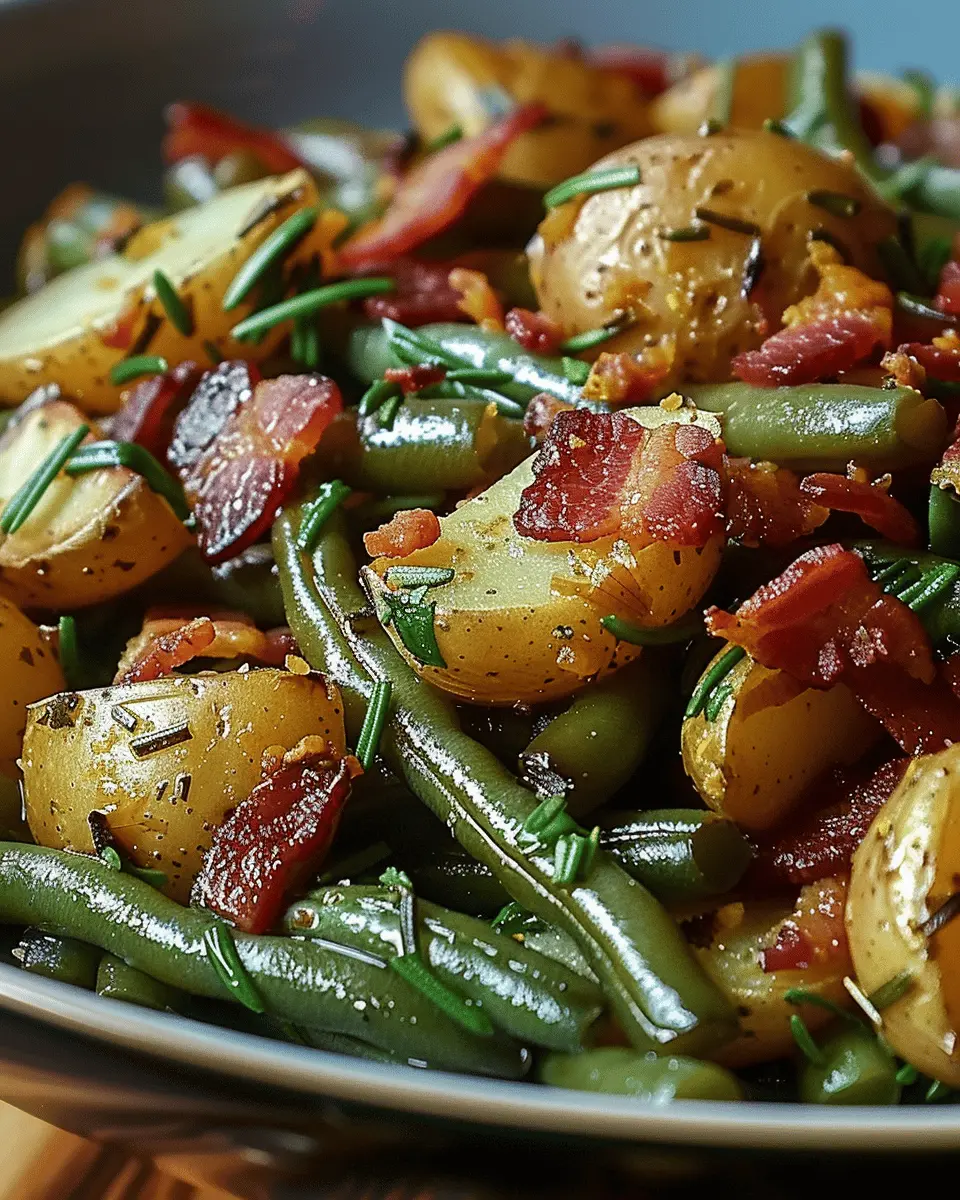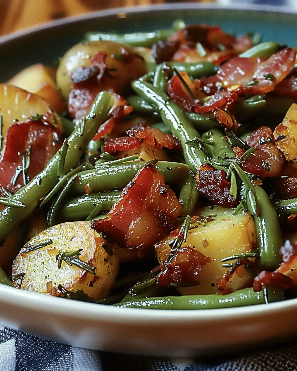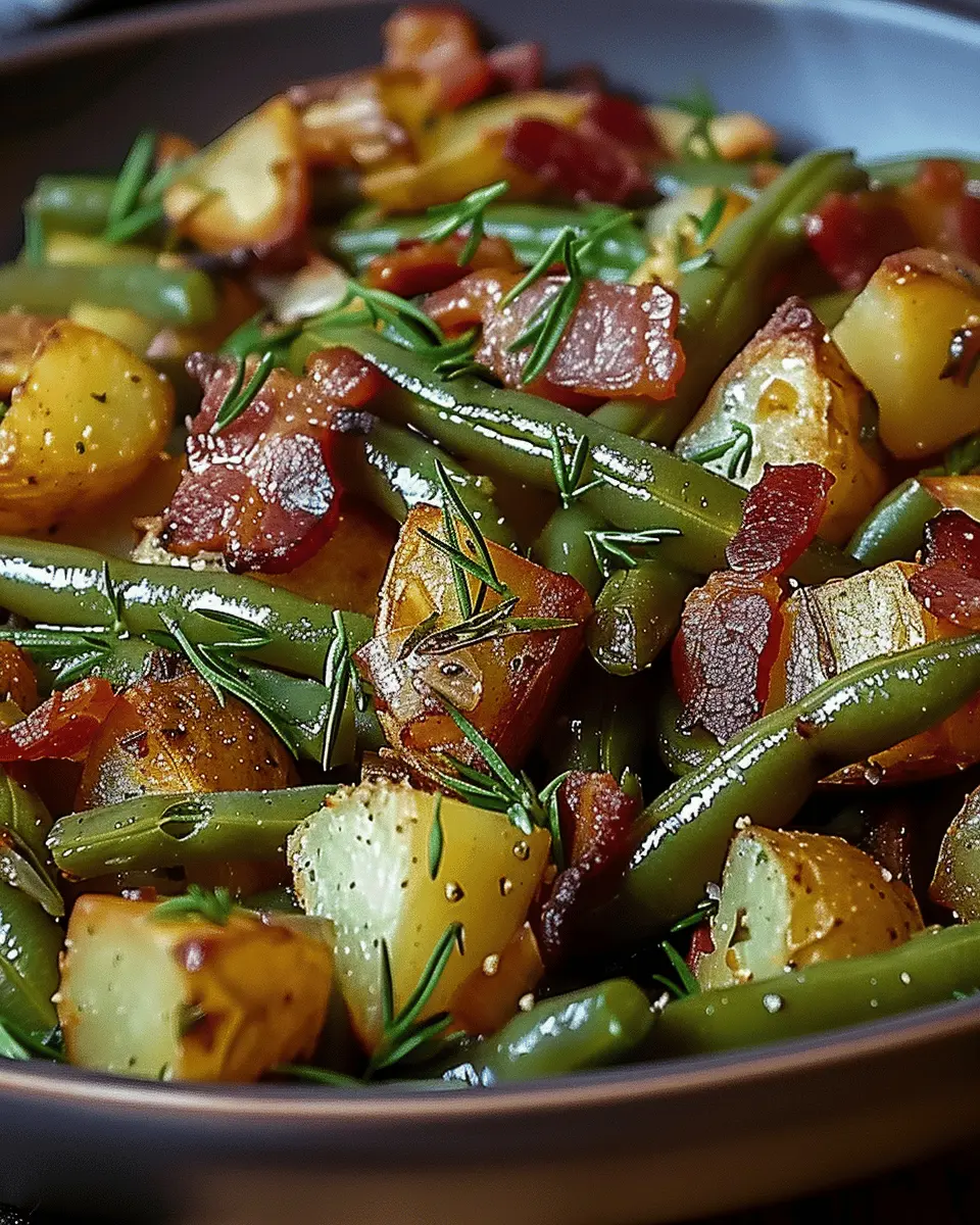 A delicious and healthy side dish featuring green beans and potatoes, enhanced with turkey bacon for a flavor-packed experience.