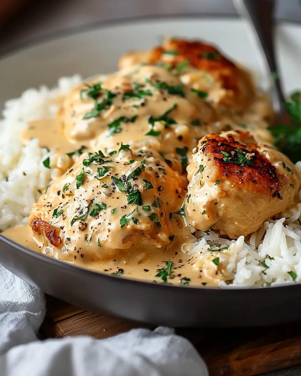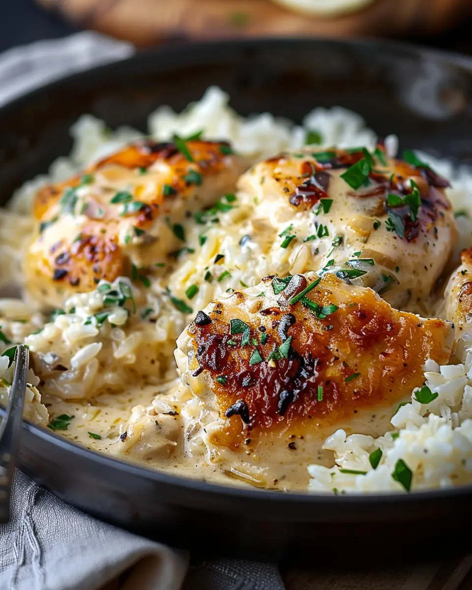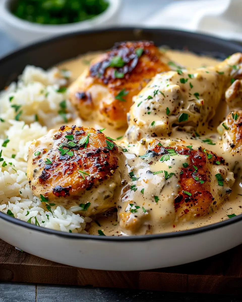 A delightful recipe for creamy smothered chicken served over rice, perfect for a comforting dinner.