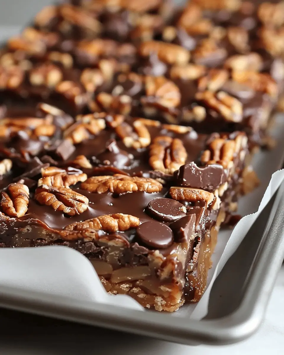 Delight in these easy turtle bars that combine rich chocolate, caramel, and crunchy nuts for a homemade treat.