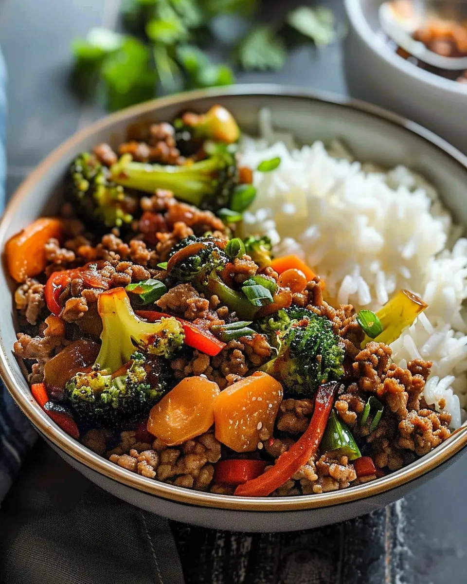 Spicy Ground Beef Stir-Fry Bowl with Garlic Veggies & Rice Delight