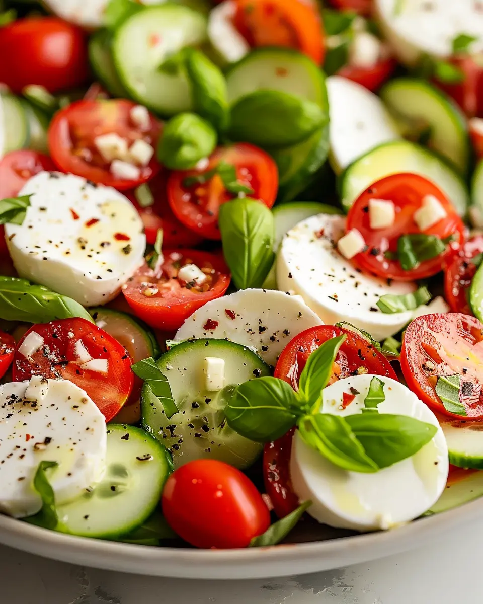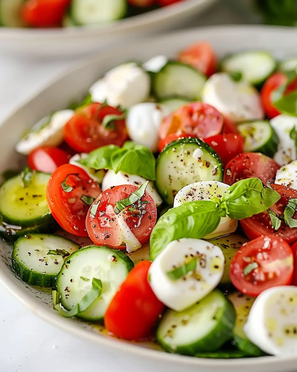 • Assembly: Slice the cucumbers, tomatoes, and mozzarella into bite-sized pieces. Toss them gently with torn basil leaves, drizzle with olive oil, and finish with balsamic vinegar.