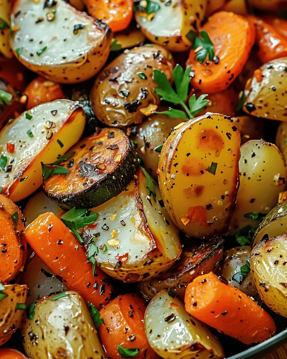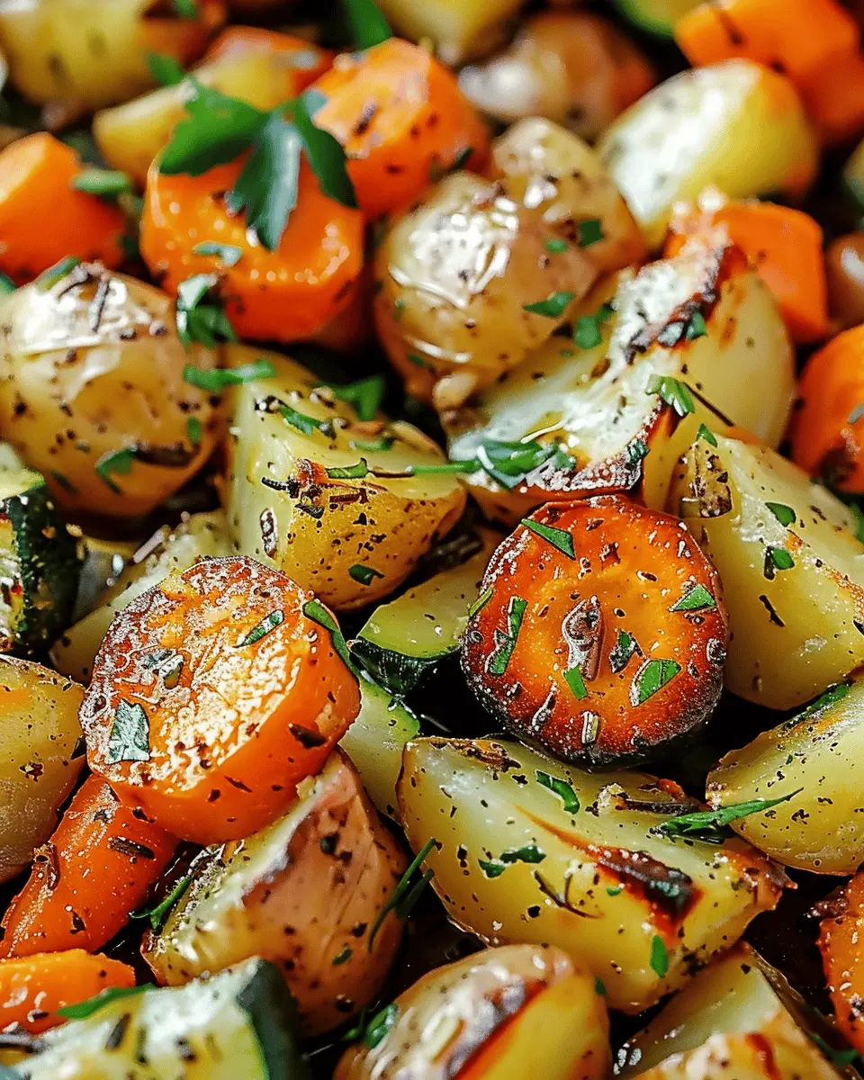 Deliciously roasted potatoes, carrots, and zucchini seasoned with garlic and herbs for a flavorful side dish.