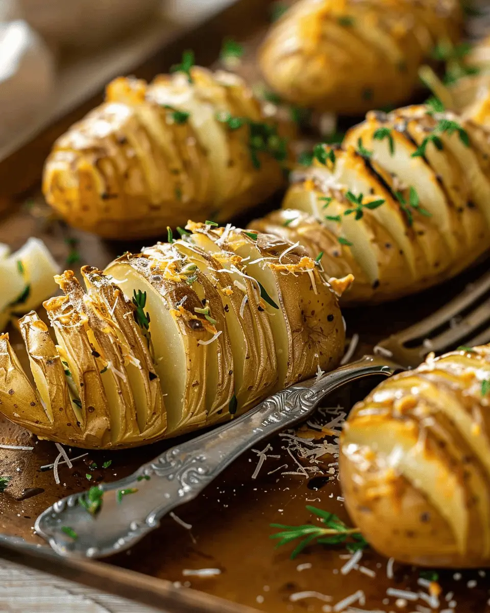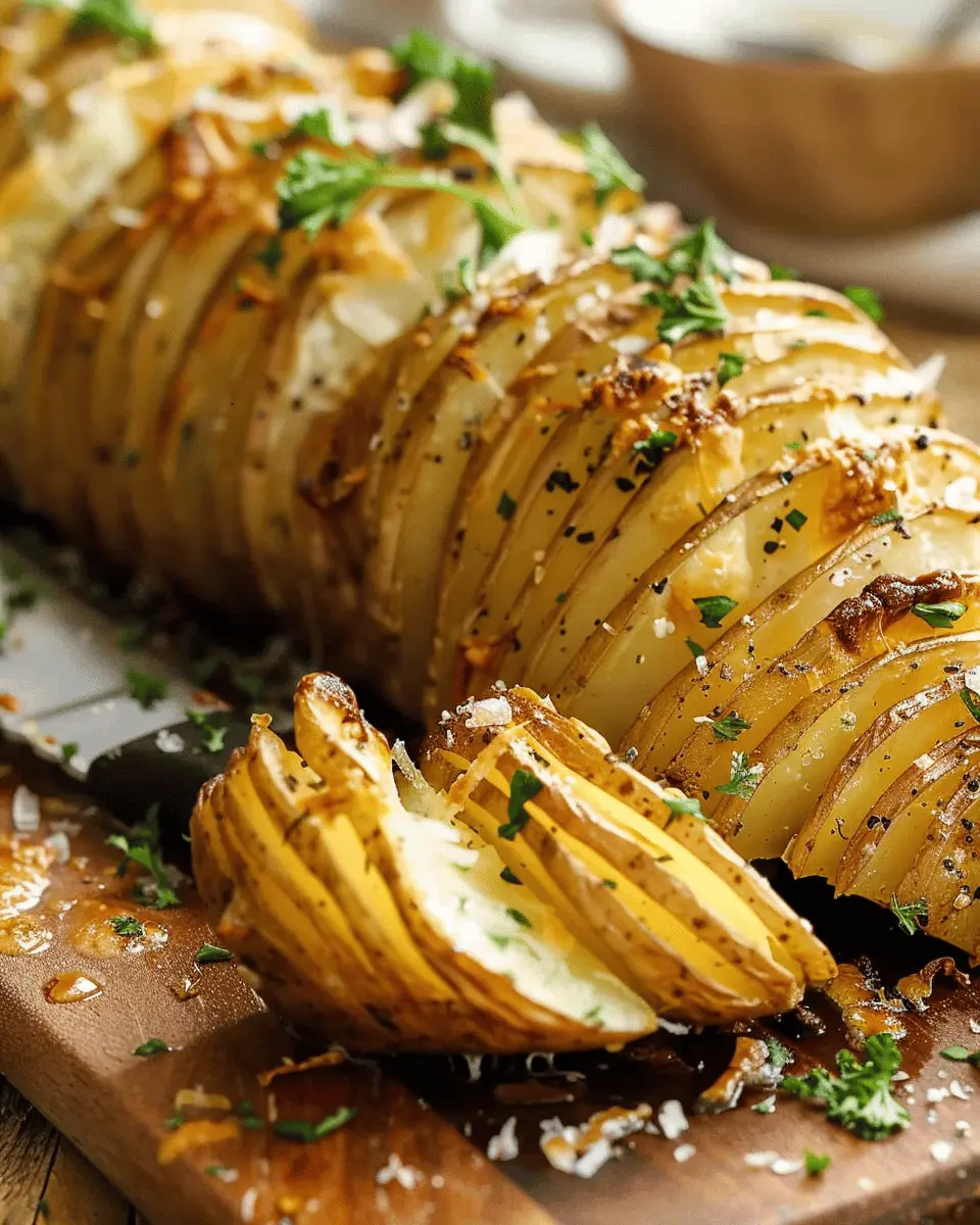 Transform your Hasselback Potatoes into a fragrant herb-infused delight. Combine fresh herbs like rosemary, thyme, and parsley with olive oil, salt, and pepper, then brush this mix over the potatoes before roasting. The herbs will infuse their aromatic flavors as the potatoes cook. Consider garnishing with freshly grated Parmesan for a gourmet touch. This variation is not only delicious but also makes for a vibrant centerpiece on your dinner table.