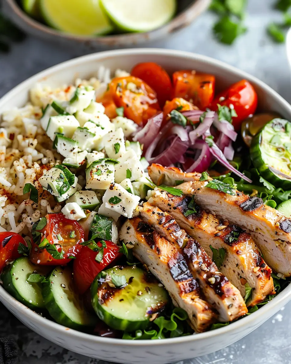 Balanced Meal: A well-composed Greek chicken bowl provides a healthy balance of protein, fats, and carbohydrates, ensuring you feel full and satisfied while keeping energy levels up for the next day’s hustle.