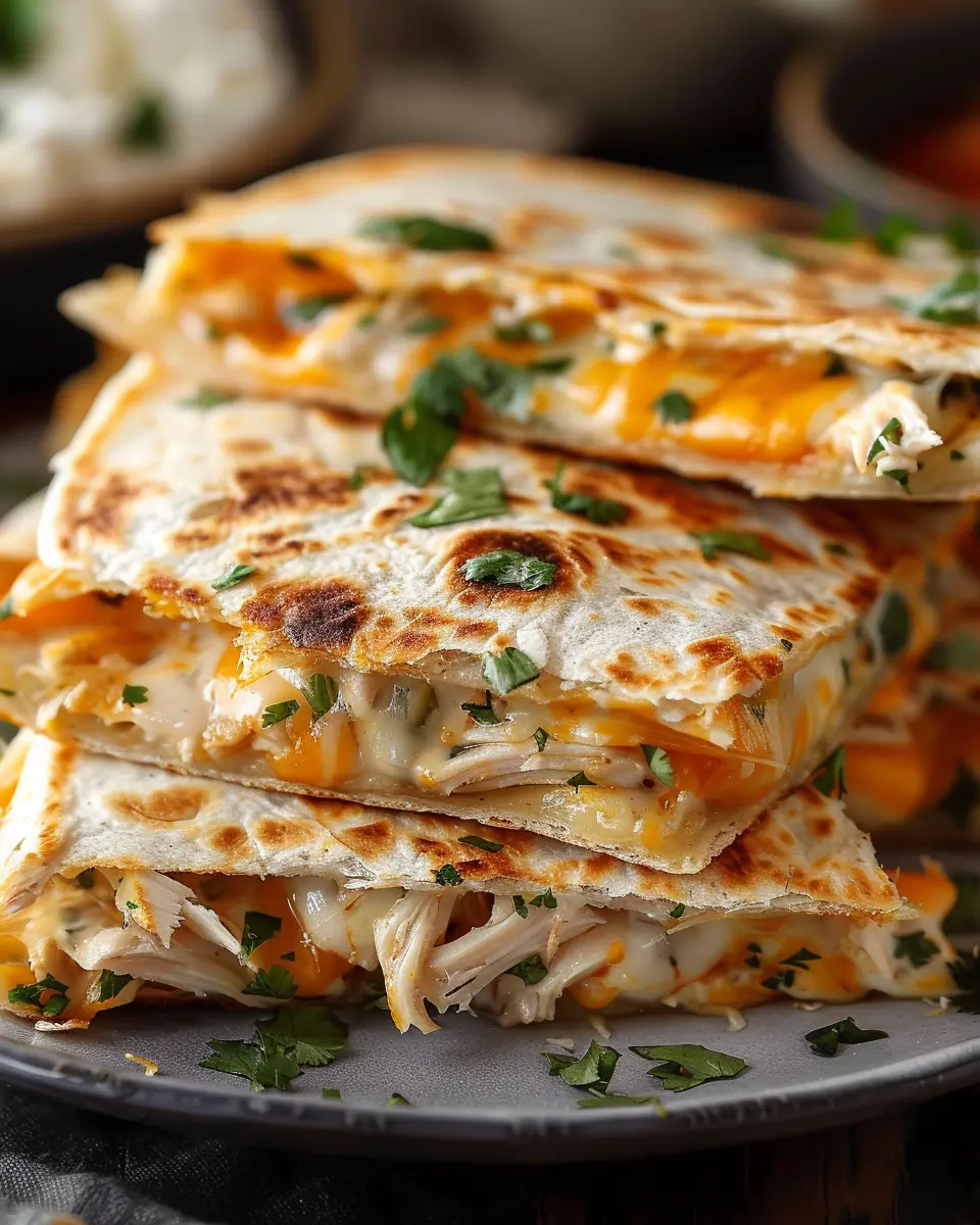 Layer Wisely: Start with a layer of shredded chicken, followed by cheese, ranch seasoning, and any additional toppings. This ensures each bite is packed with flavor and maintains the quesadilla’s structure.