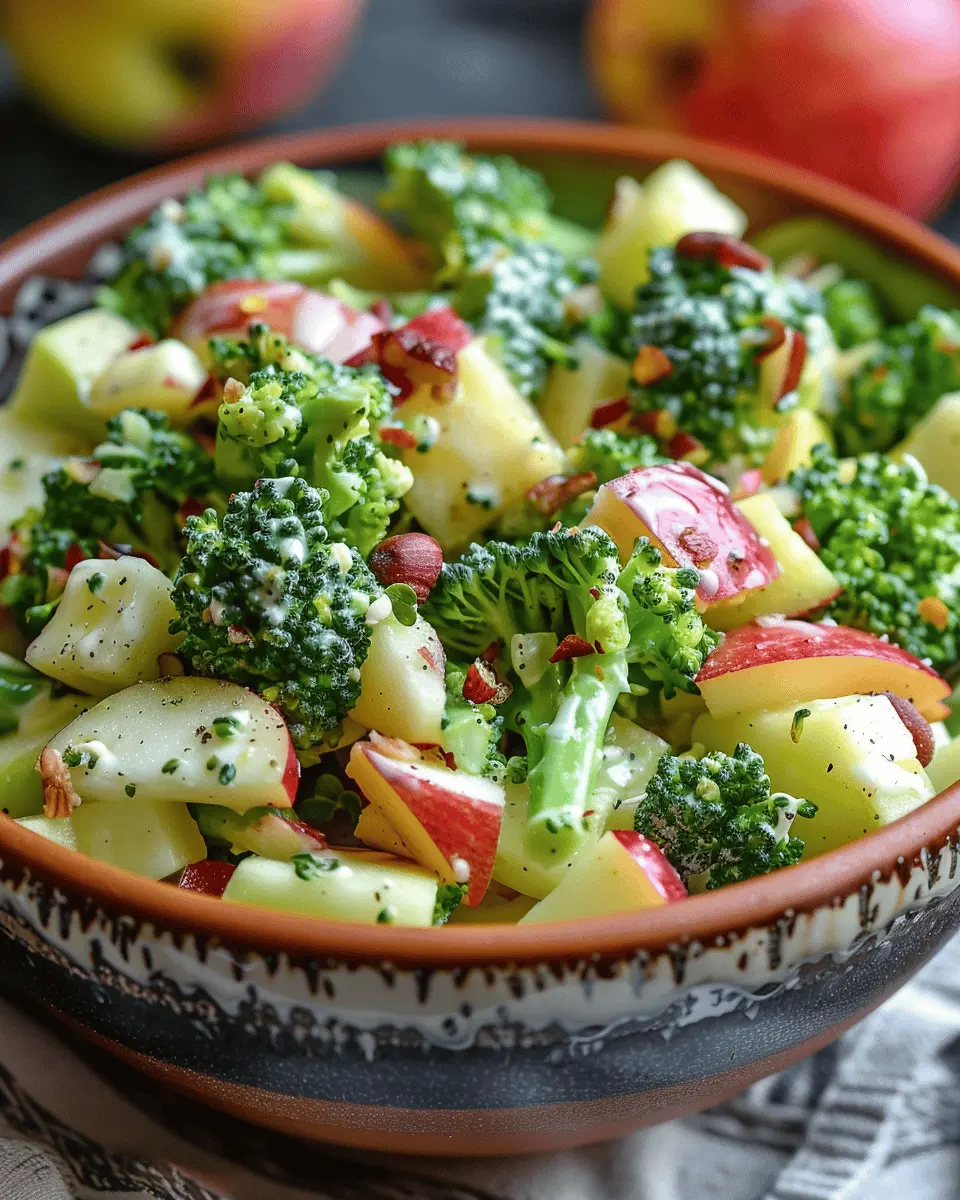 A refreshing and nutritious salad featuring Honeycrisp apples, crispy turkey bacon, and vibrant broccoli, perfect for a healthy meal.