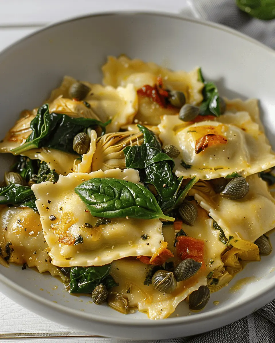 A delicious and easy recipe for ravioli featuring artichokes, capers, and spinach.
