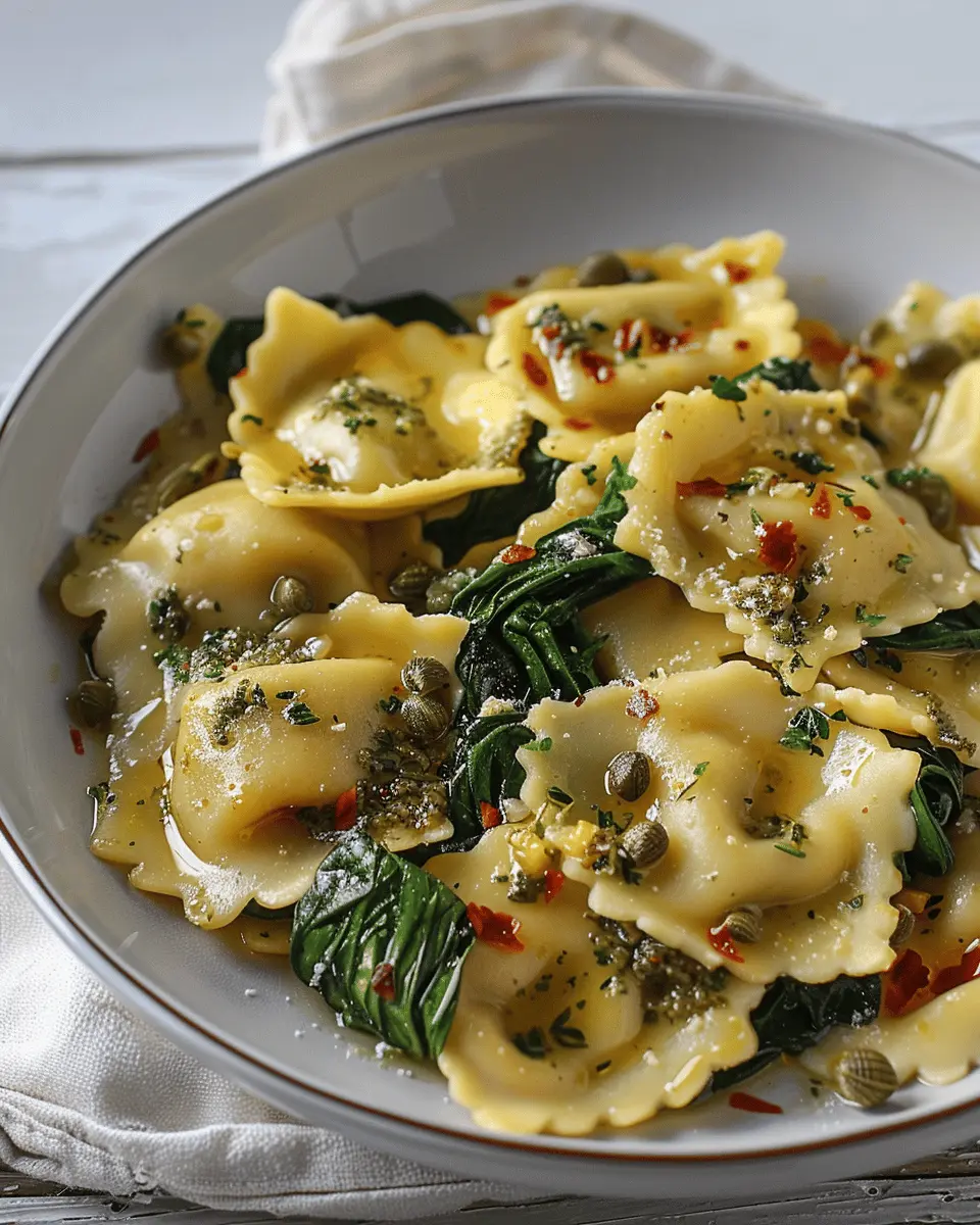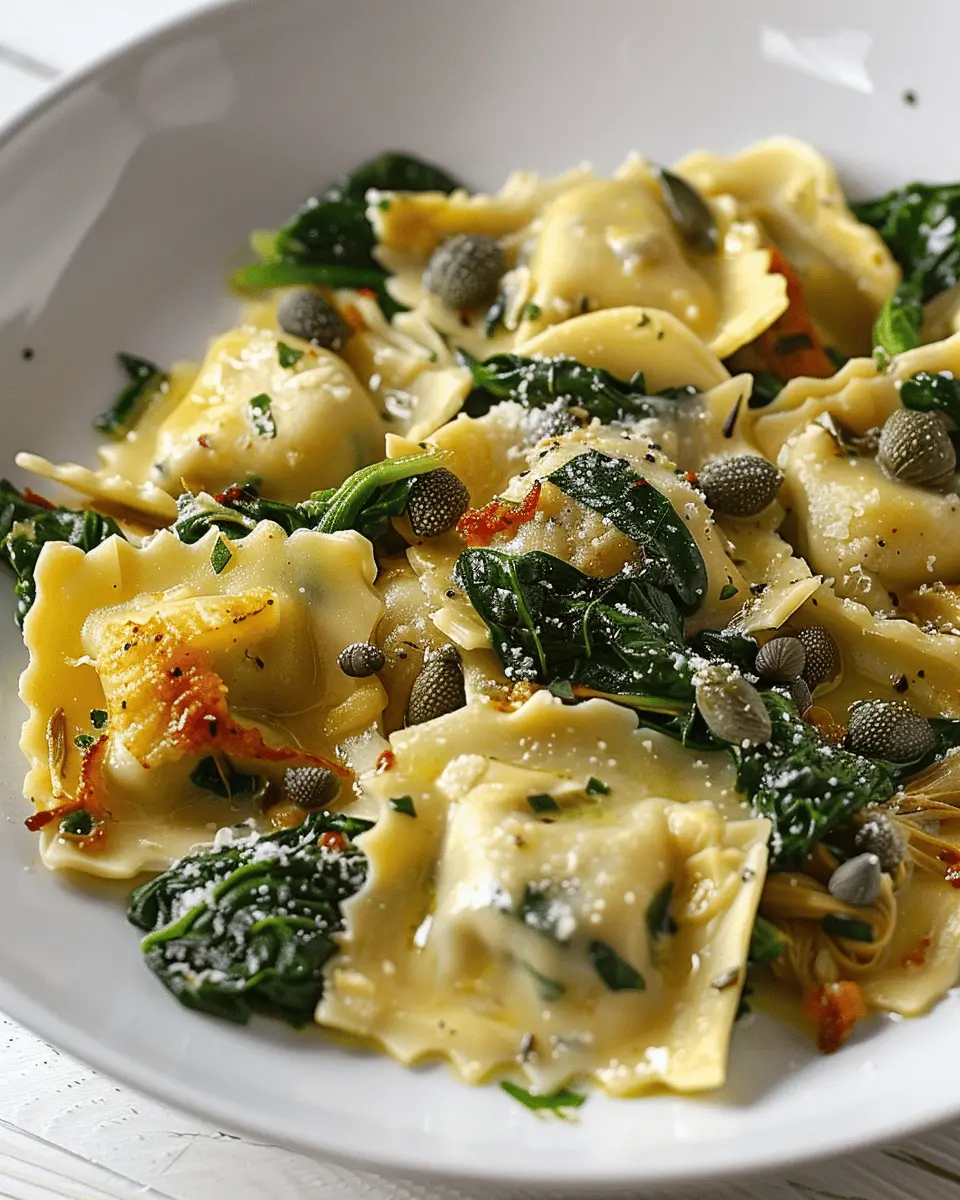 Once you’ve prepped everything, the cooking process will take around 20 minutes. This includes sautéing your spinach, artichokes, and capers, not to mention cooking the ravioli until they’re perfectly al dente. Remember, cooking is all about timing, so stay engaged for that perfect tender bite.