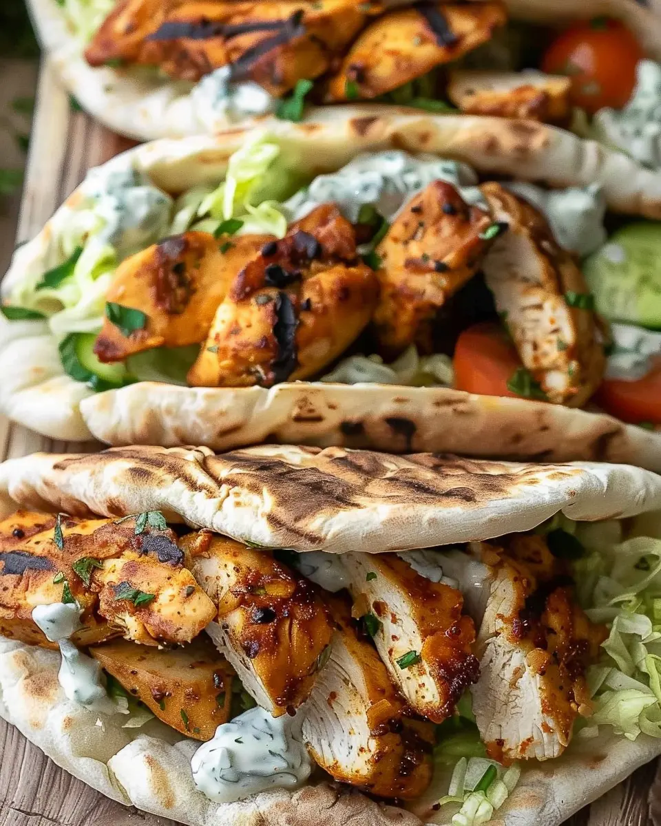 - Once done, slice the chicken and stuff into warm pitas with mixed greens, tomatoes, cucumbers, and drizzle with herby ranch dressing.