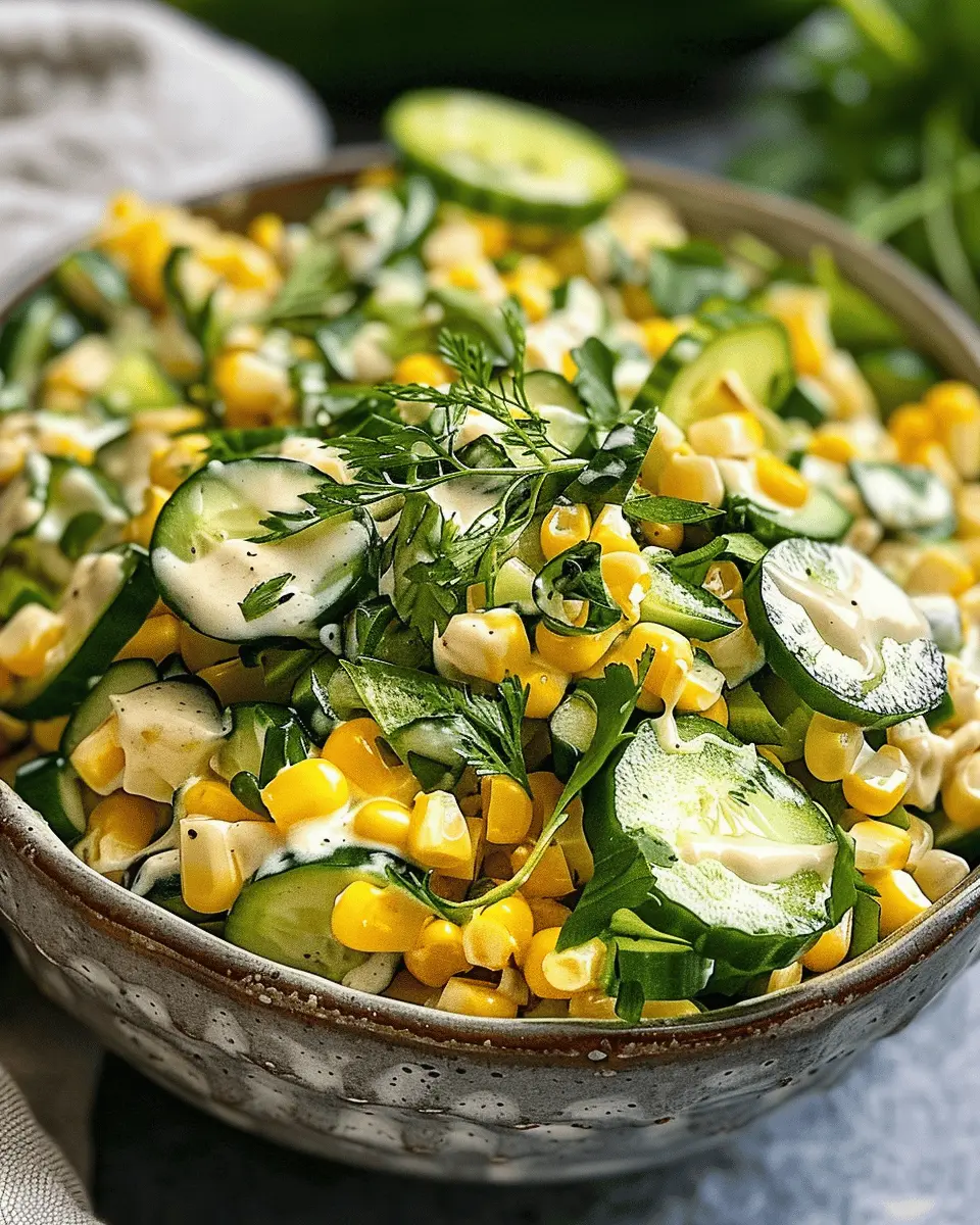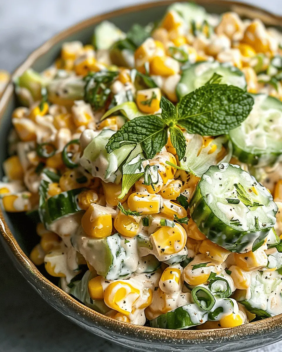 A refreshing and creamy salad that combines the flavors of sweet corn, crisp cucumbers, and savory turkey bacon.