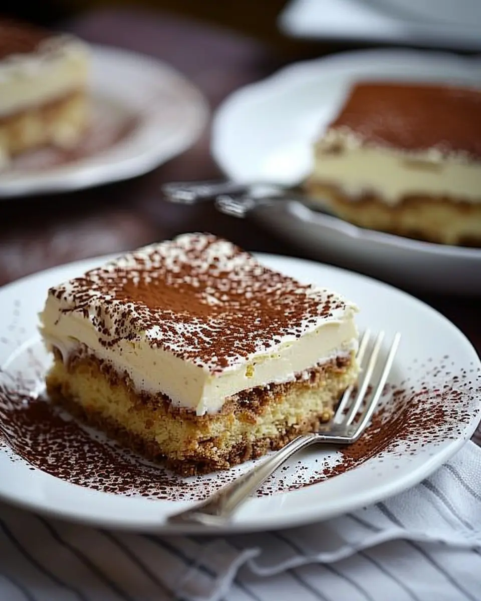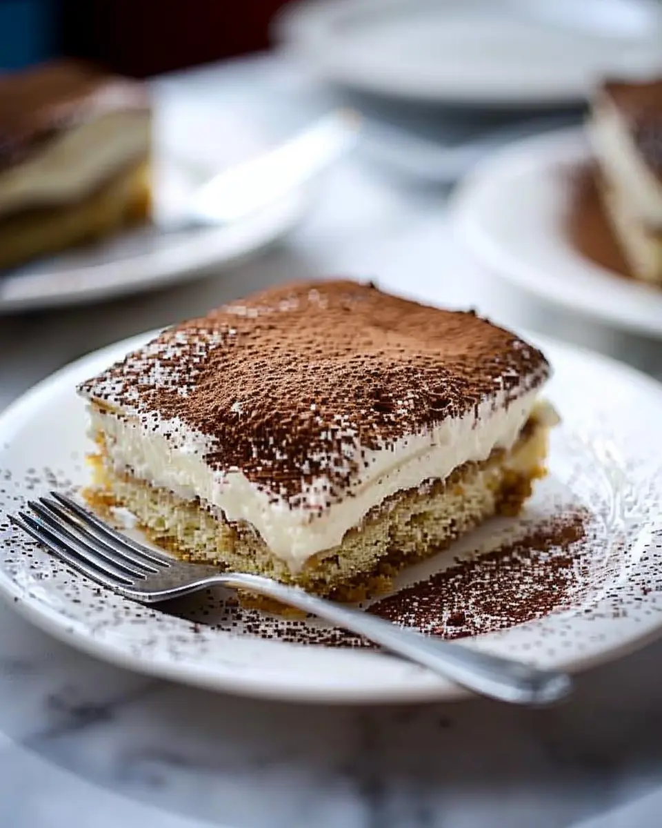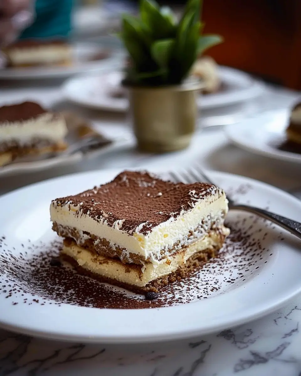 After chilling, remove your tiramisu from the fridge and dust the top generously with cocoa powder to give it that signature finish. Cut into squares and serve to your guests—you’ll be met with happy smiles and satisfied sighs!